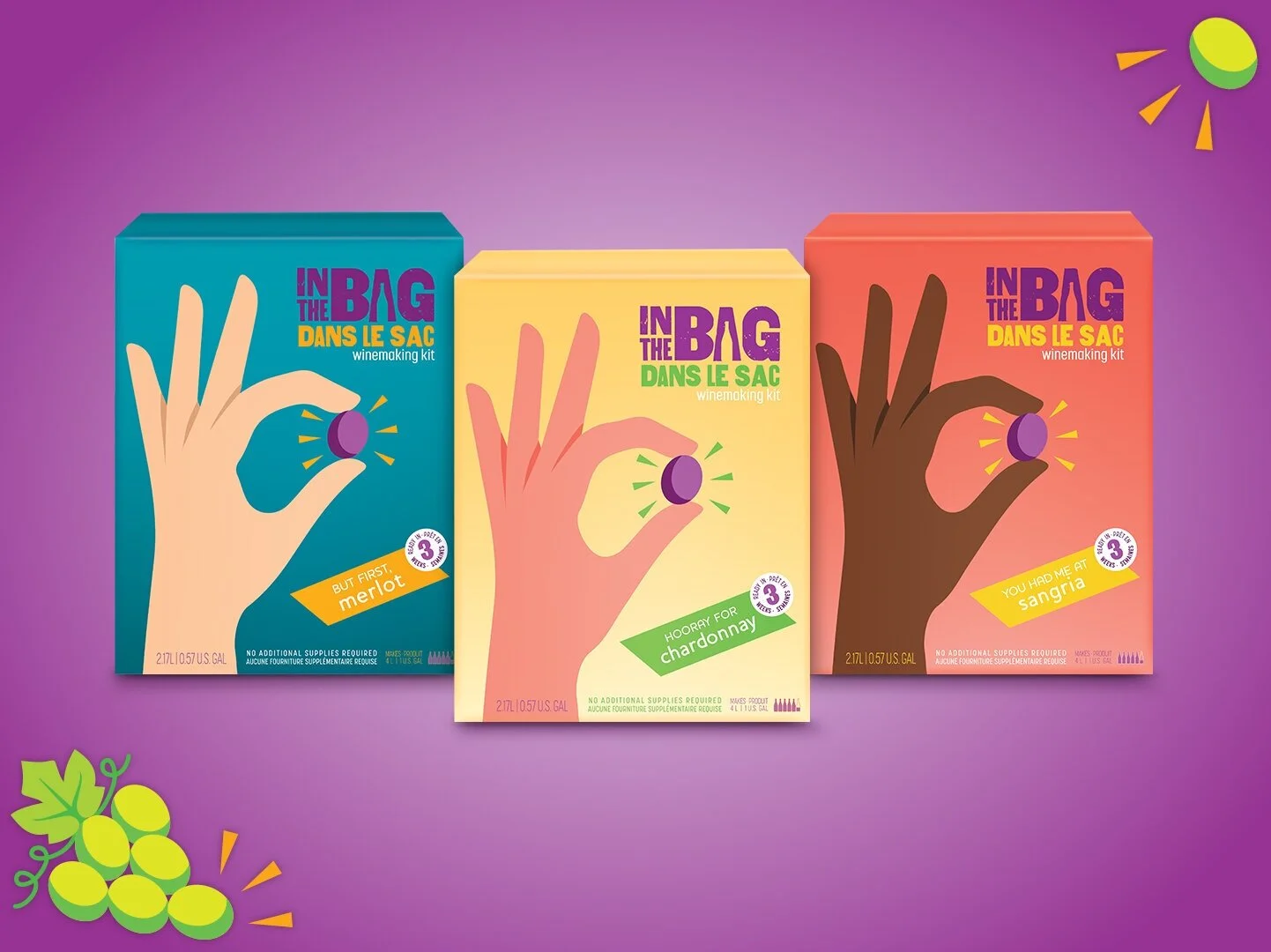 Challenge: Create a brand and package for “In The Bag,” a kit that includes everything you need to make your own wine at home. The design should emanate “fun,” as well as highlight the product’s ease of use and economical benefits.